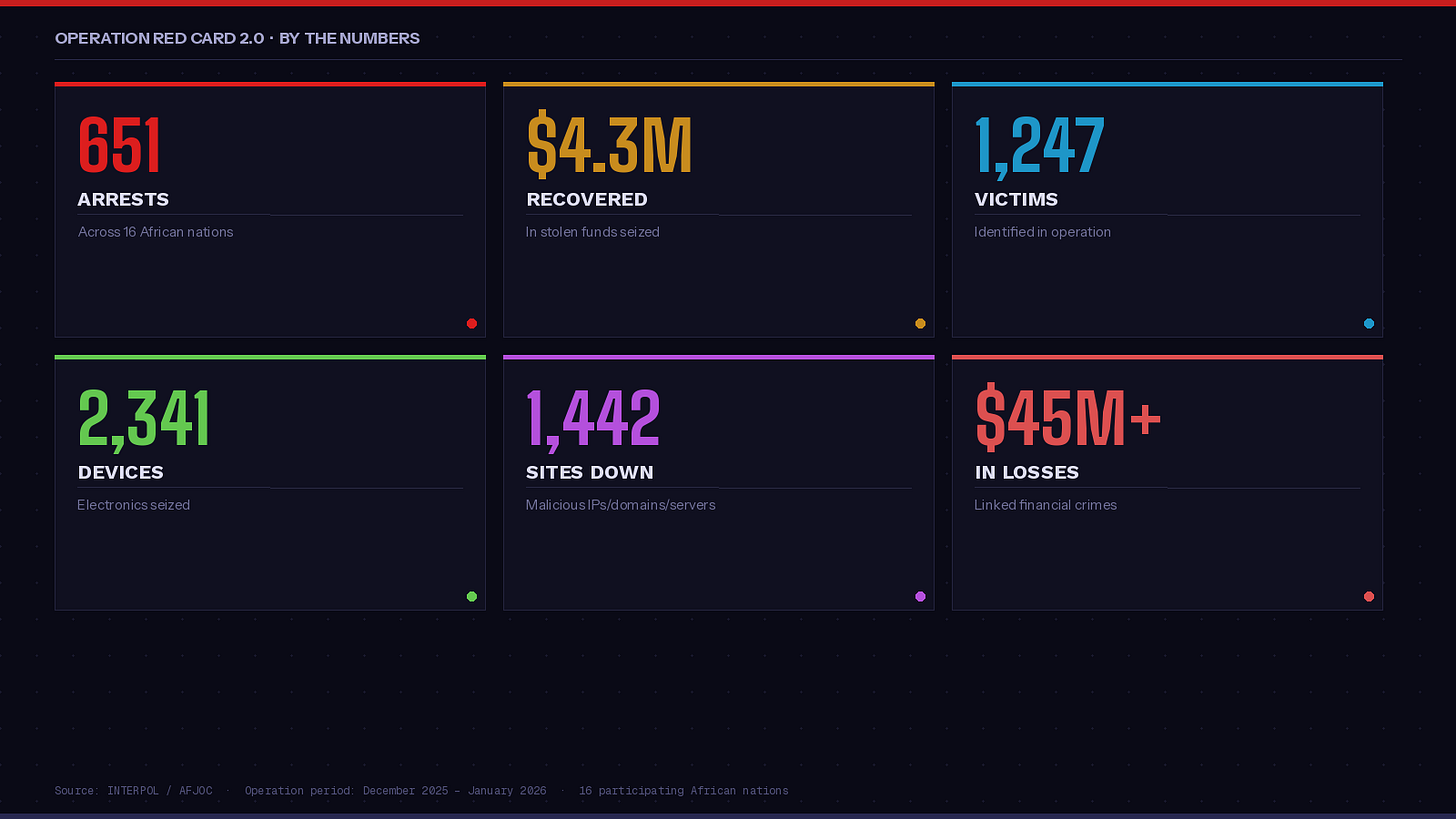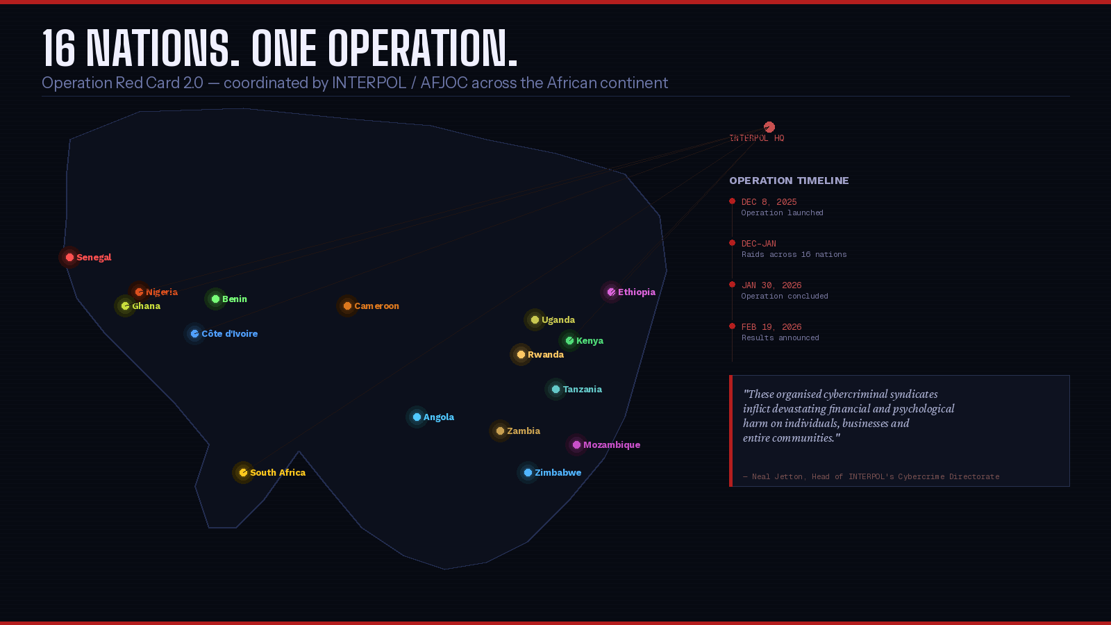 Running from December 8, 2025, to January 30, 2026, Operation Red Card 2.0 targeted the specialized groups running the most lucrative scams on the continent: